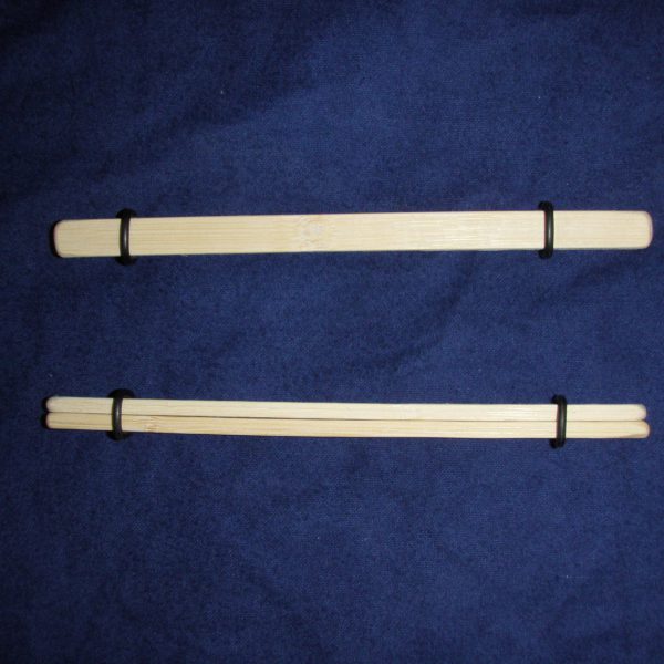 They are made out of smooth Bamboo sticks, about 6″ long, 1/8″ thick and 3/8″ wide with rounded ends. Also work very well for other juicy parts 😉 Pressure depends on how close you bring the very strong rubber rings together.