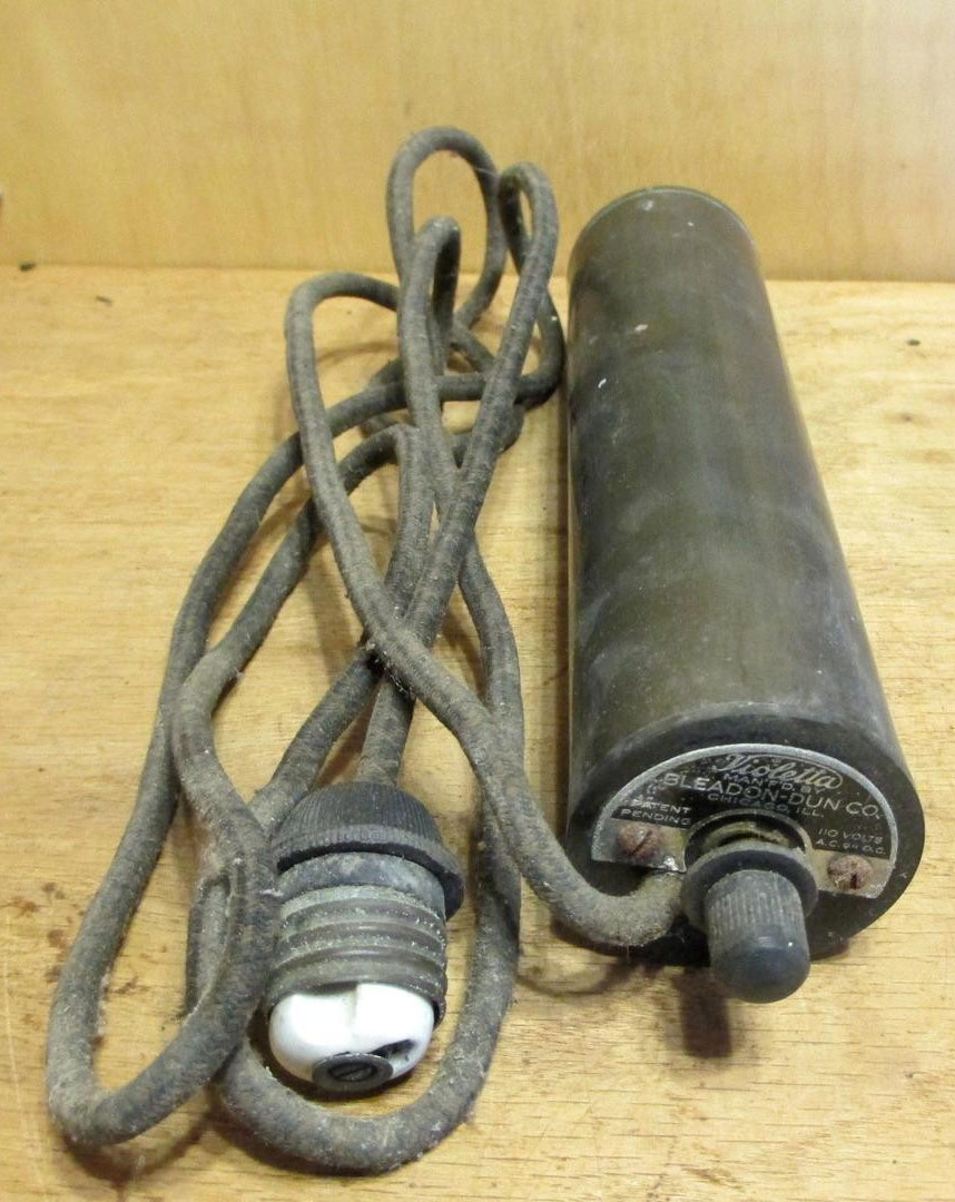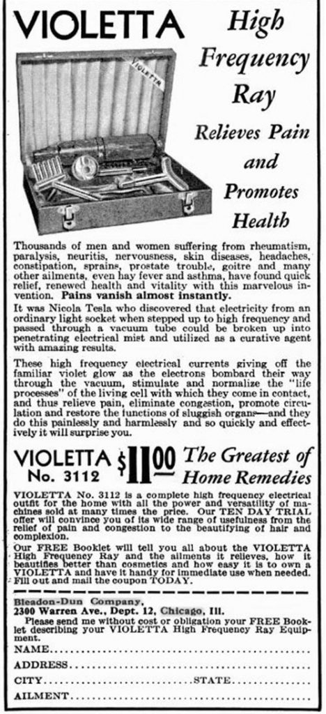 Tesla and Paul Oudin designed the first device together. Oudin then built the first “violet ray” device (though the name wasn’t used yet at that time) and wrote an article on using it to cure skin disorders the next year. The device was first presented at the World’s Columbian Exposition in Chicago in 1893 among Tesla’s inventions on display (he also illuminated more light bulbs with AC at that fair than the whole city of Chicago had at the time).